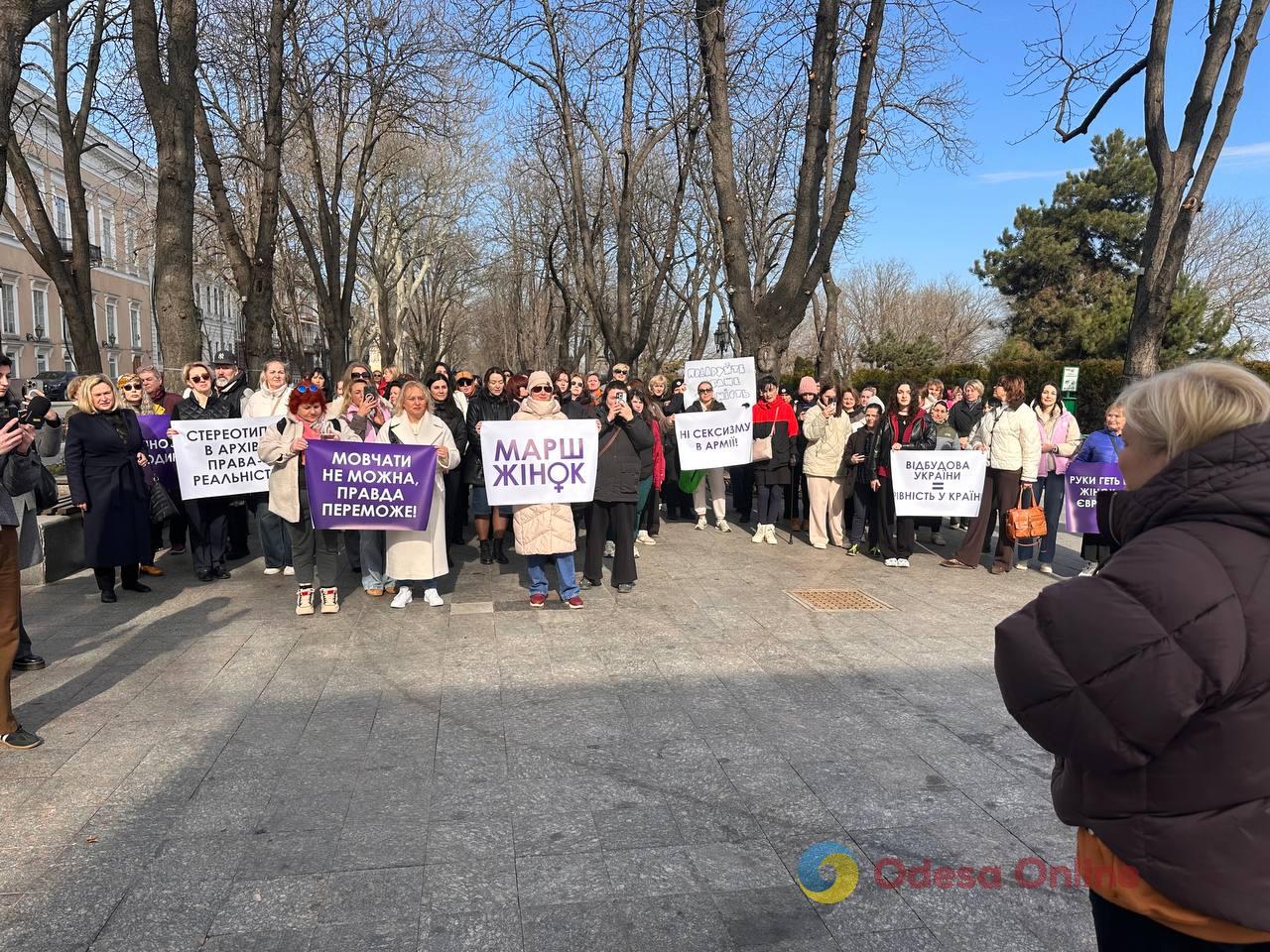Не обійшовся тиждень без масових заходів — 5 березня в Одесі відбувся Марш за права жінок. Учасниці зазначили, що заявляють таким чином про те, що свято 8 березня — це про право жінок на безпеку, гідність і захист.