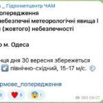 І тут ми бачимо дивну картину. 30 вересня, ранок. На 8:00 – жовтий рівень небезпеки. Буквально це означає: так, можуть бути проблеми з дорогами чи комунальними службами, але прямої загрози життю начебто немає. Тобто, підприємства працюють, діти можуть перебувати у школах та дитсадках, не зупиняється громадський транспорт та ін.