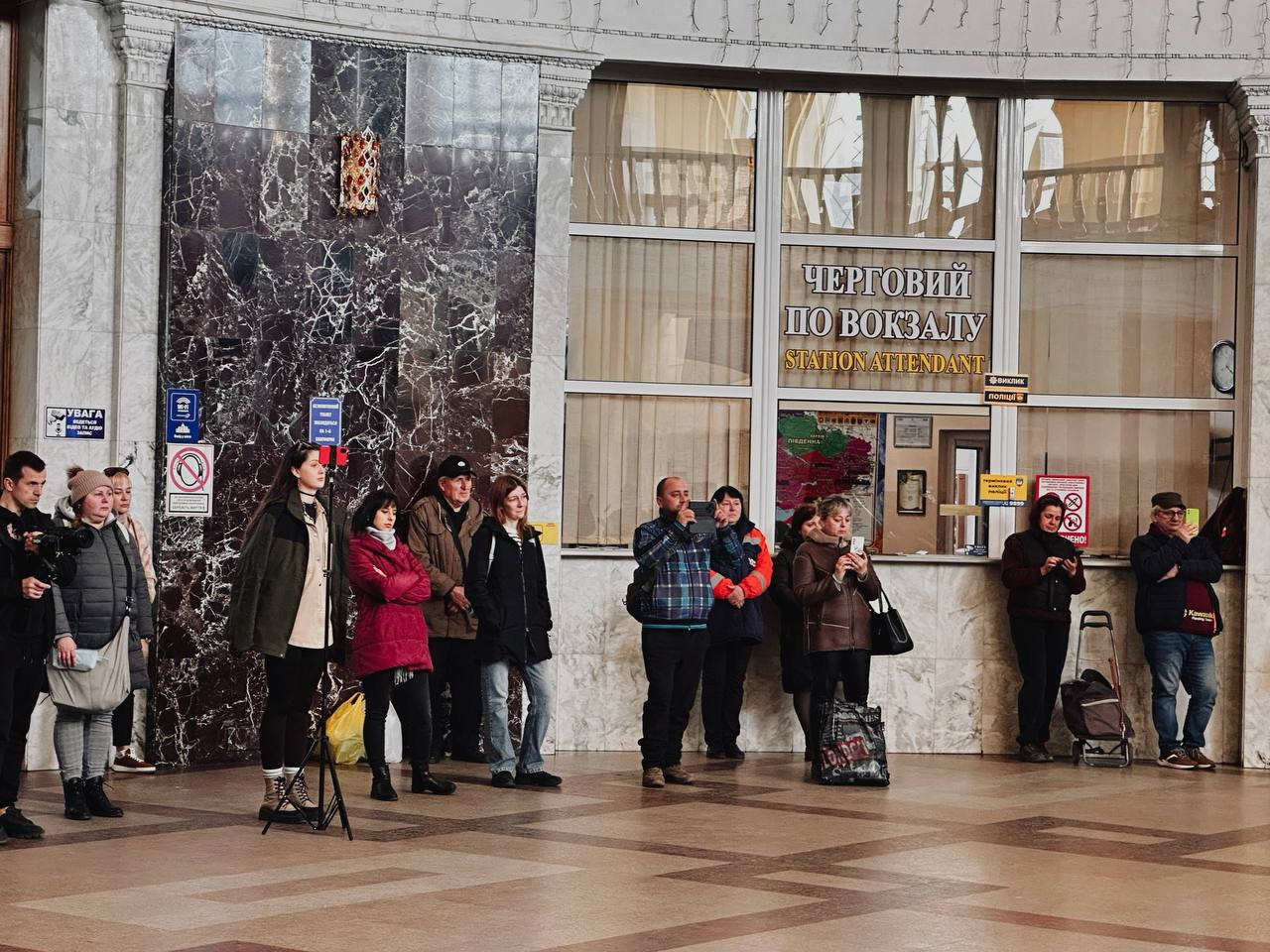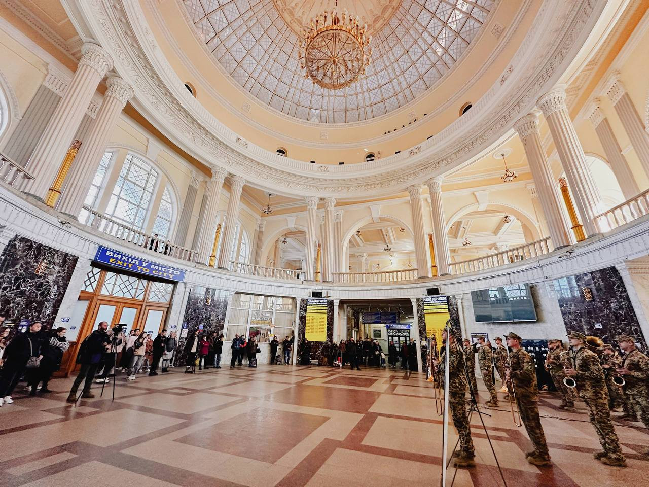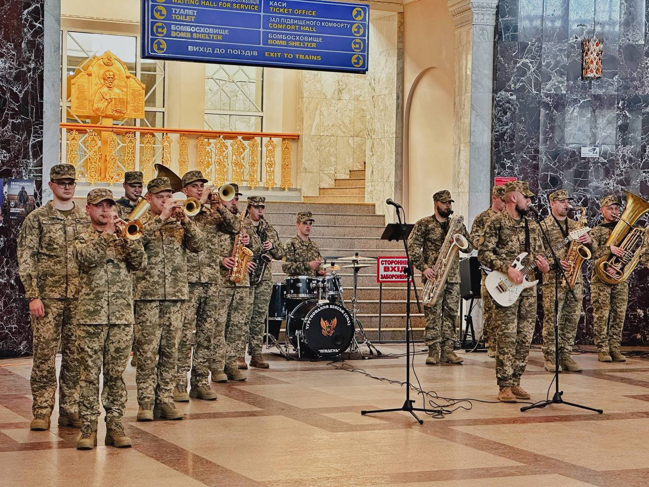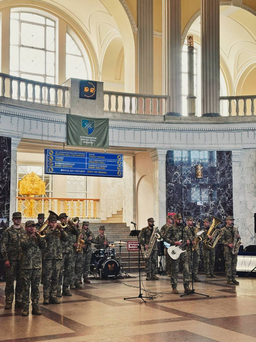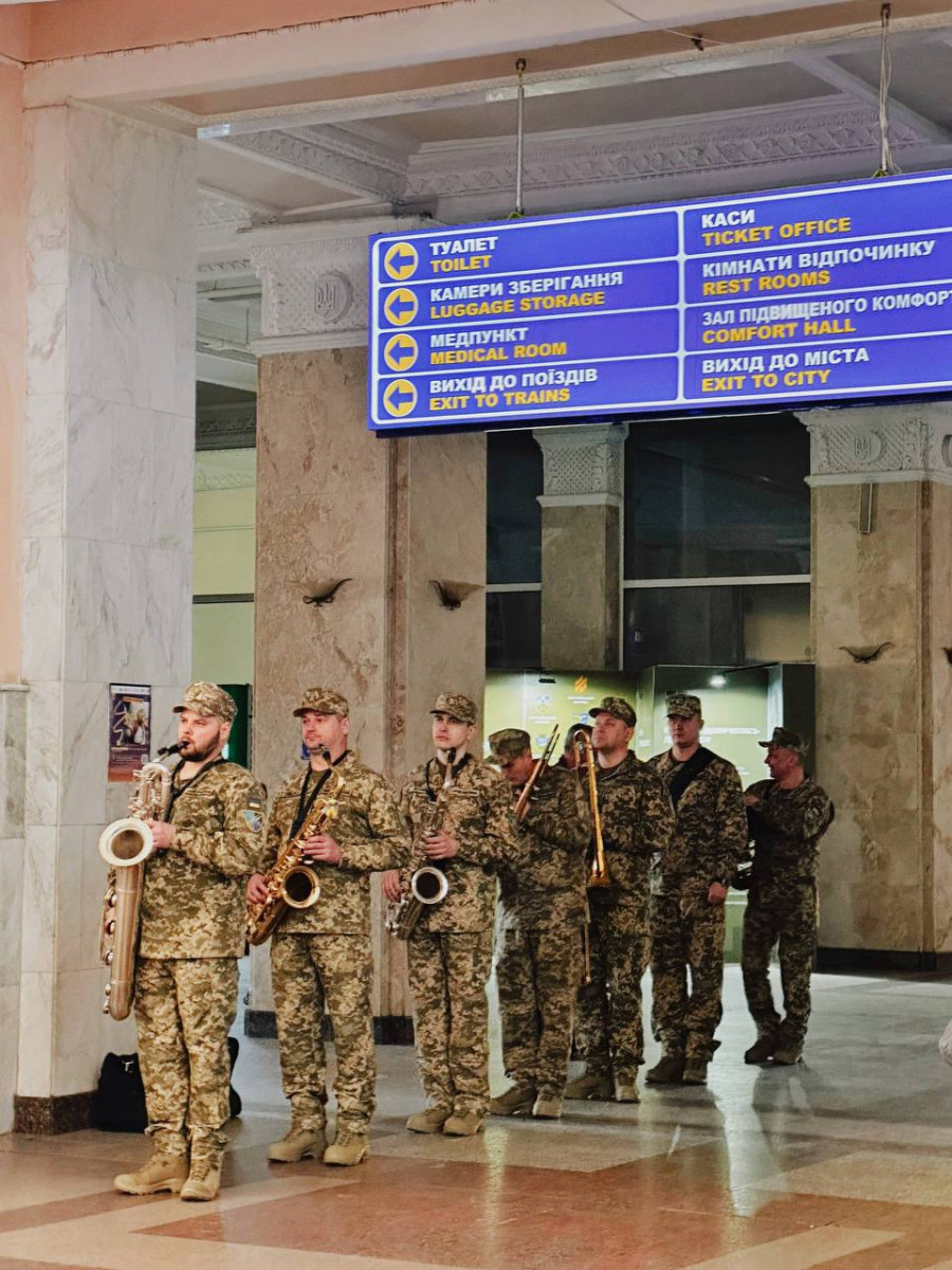 Военные музыканты исполнили программу из украинских и мировых композиций в современном аранжировании. Выступление собрало пассажиров «Укрзализныци» и жителей города.